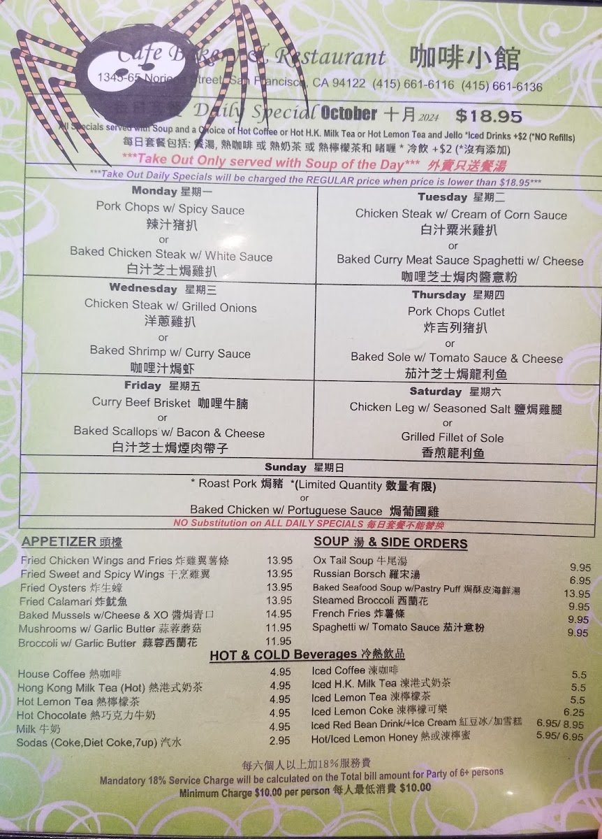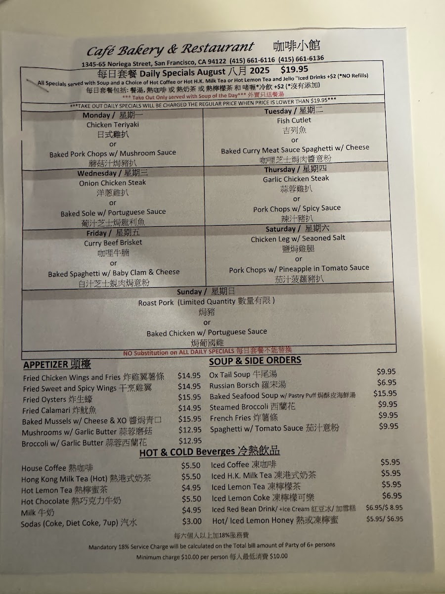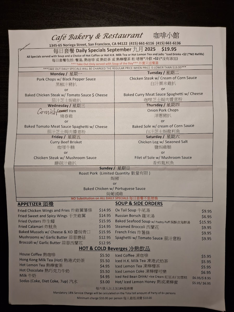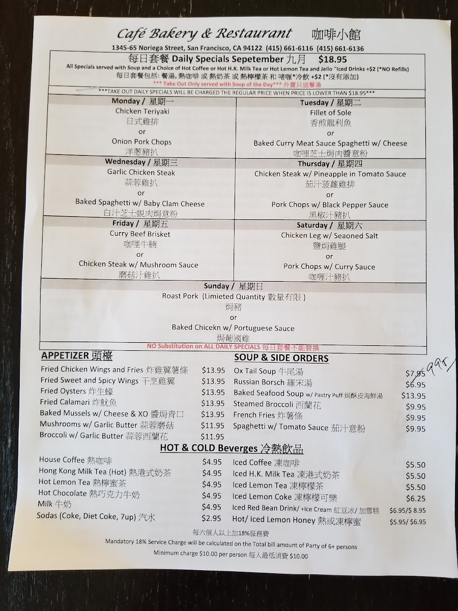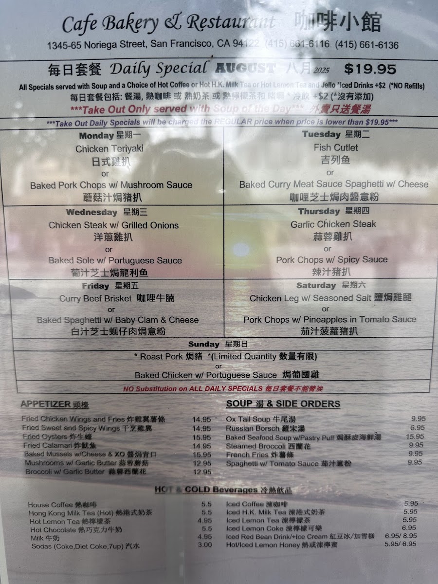 If you’re on the lookout for a delightful culinary experience in San Francisco, look no further than Cafe Bakery Restaurant. Nestled at 1365 Noriega St, this hidden gem brings the vibrant flavors of traditional Chinese cuisine, with a particular emphasis on Hong Kong-style dishes. Whether you’re a local or just passing through, this eatery promises a memorable dining experience bursting with rich tastes and comforting portions.